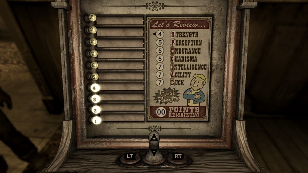 S.P.E.C.I.A.L.はこんな感じ。Luck7が確定以外は適当。INT高いと経験値増えたりインプラント?使えるんだっけ?って感じで上げています。
