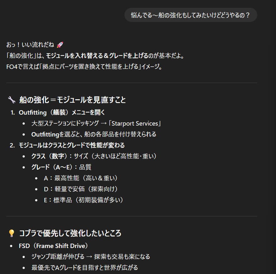 このゲームやれることがとても多いので、何を優先しようとか自分が何をやりたいかをChatGPTに聞いて整理するのを手伝ってもらっています。