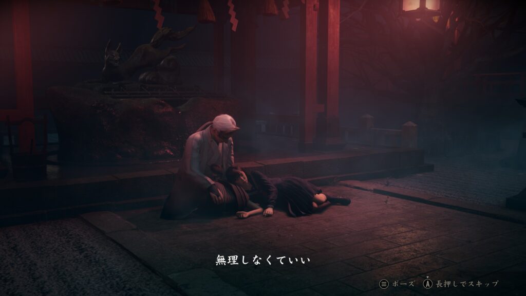 そっと肩を抱く狐面の男。
